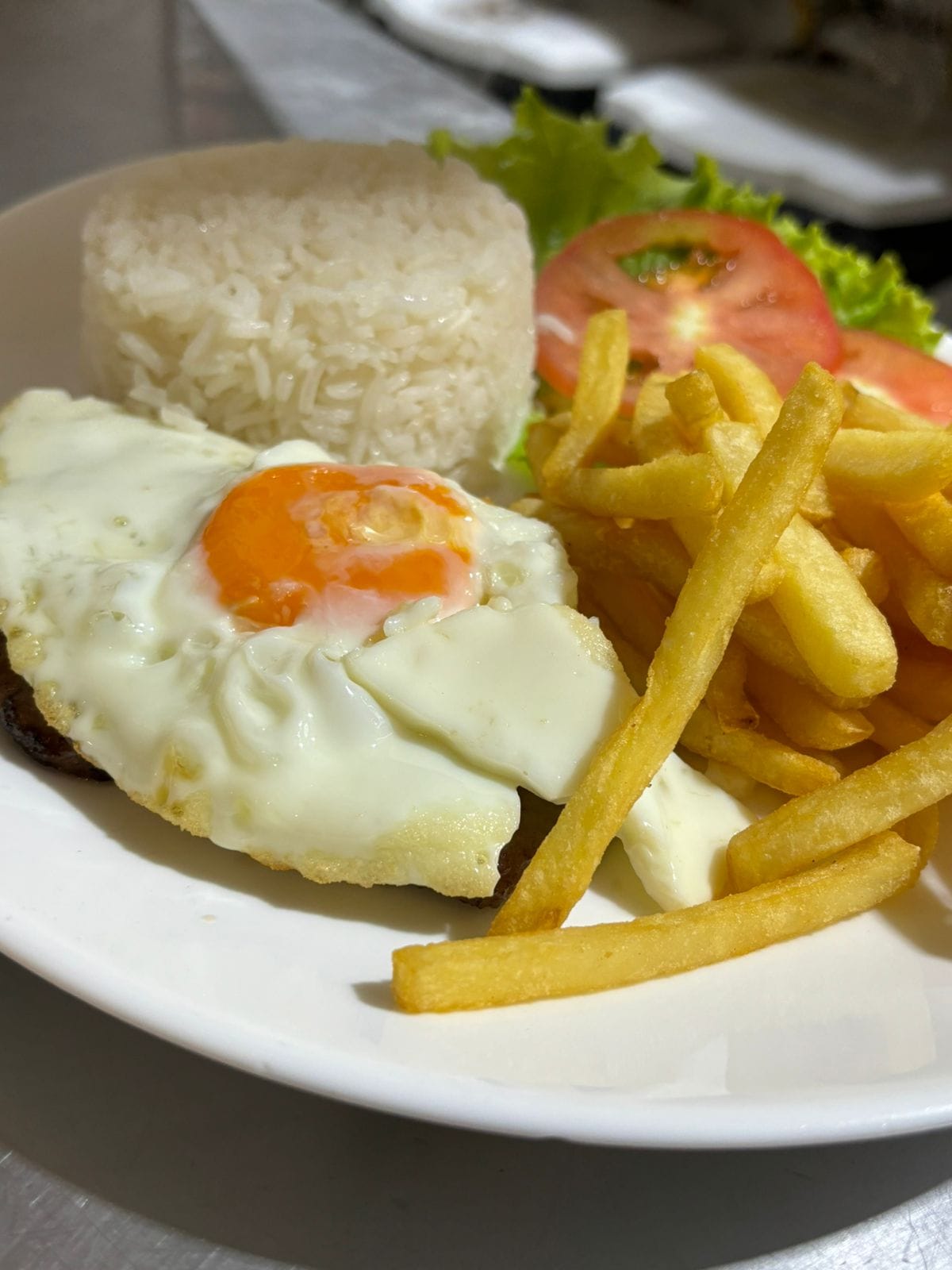 Porção de arroz, batata frita, ovo frito, salada de alface com tomate, bife grelhado de carne ou frango e feijão.