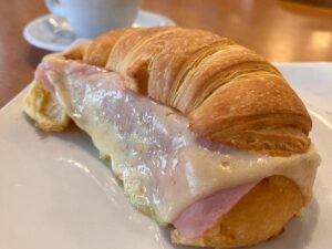 Media Luna, deliciosa massa tradicional uruguaia a base de manteiga, fofinha e saborosa. Aquecida com presunto e duas fatias de queijo Mussarela.