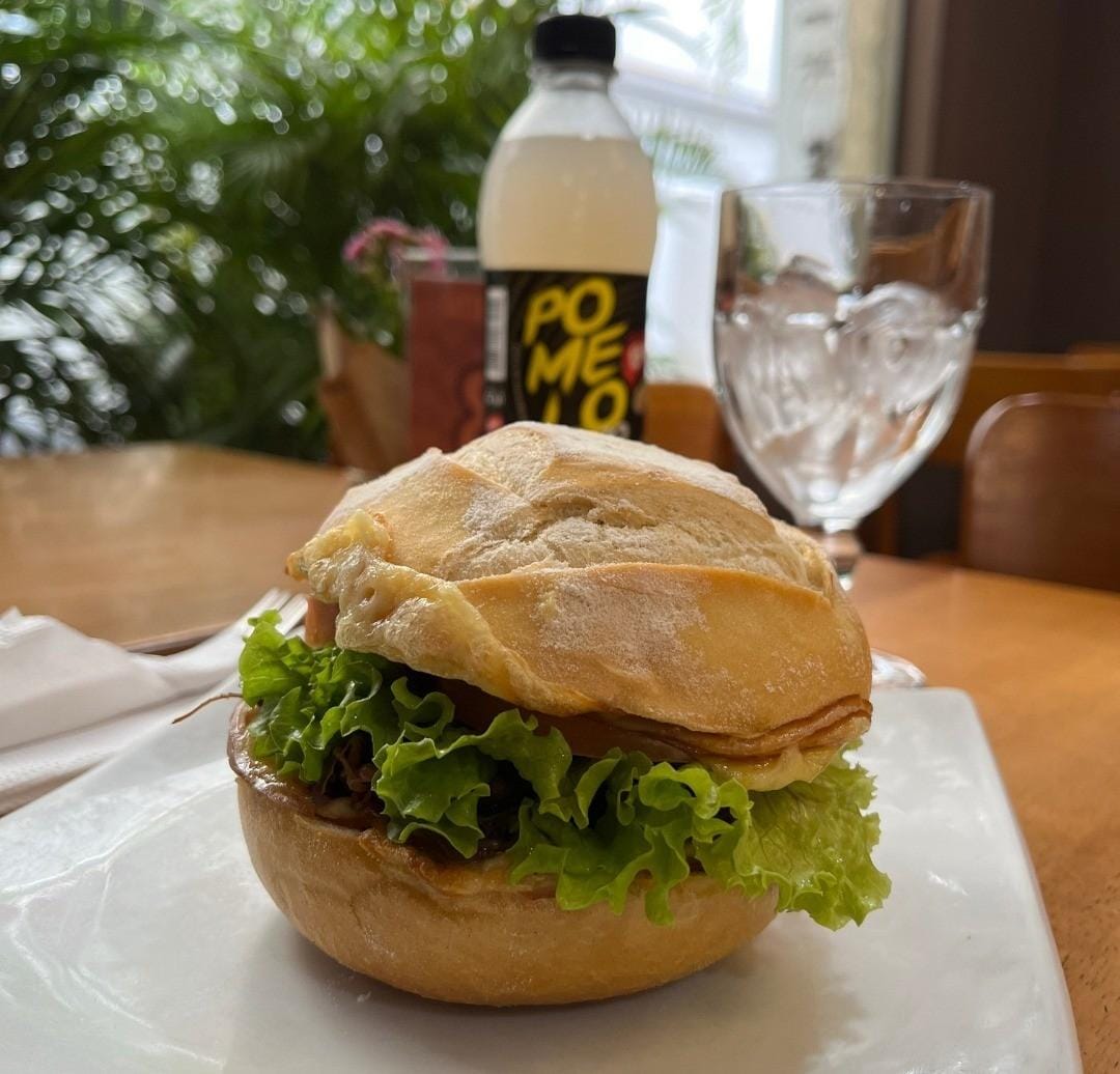 Uma explosão de sabores – pão cervejinha, provolone com carne de panela da casa, chimichurri, alface e tomate.